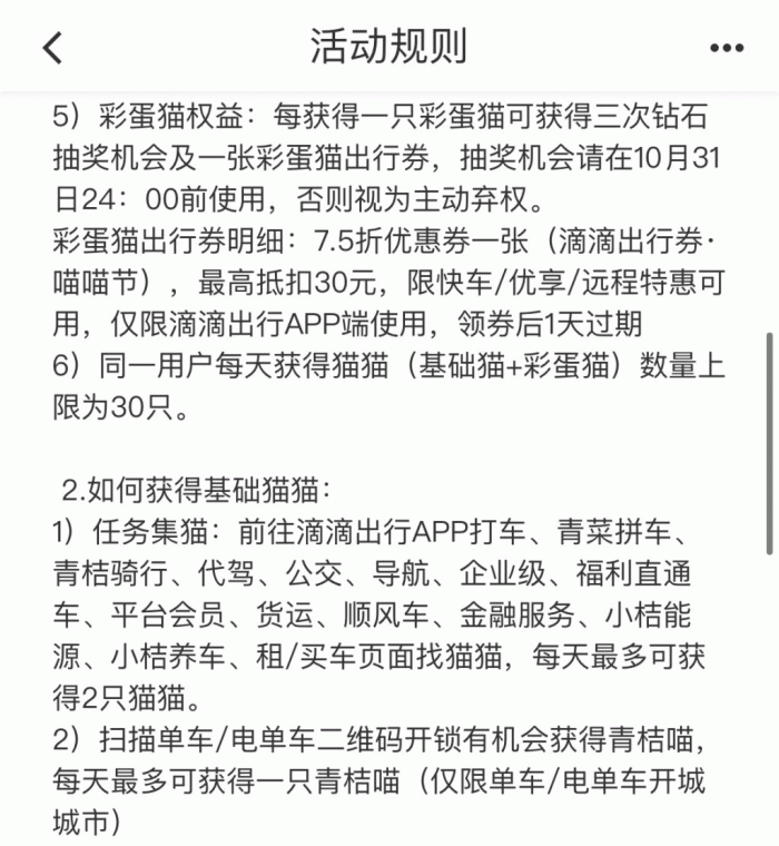 以滴滴集猫猫为例,集猫共有多种方式,用户可在APP各个页面寻找,也可通过骑行单车、使用AR扫一扫等方式获得。如果获得彩蛋猫,用户将得到一张7.5折彩蛋猫出行券。可见,虽然做游戏这件事本身是跨界,但明显游戏的玩法是与滴滴的单车、网约车等业务相连。
