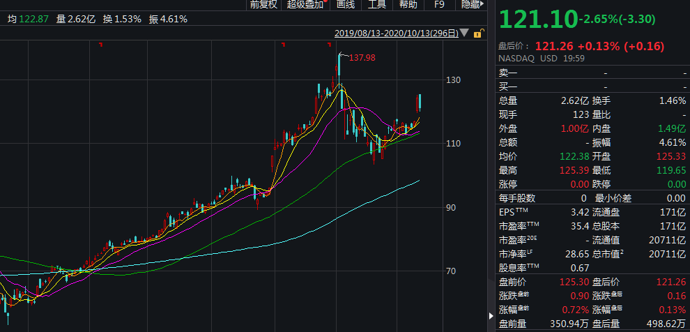 苹果公司股价在往年的发布会前后,通常先涨后跌,这次也呈现了同样的趋势,苹果股价在发布会开始的时候小幅上扬,在发布会快结束时跳水,跌幅一度达到3.6% ,最终收跌2.65%,报121.10美元。