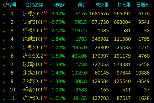 热点栏目10月14日,国内期市早盘多数品种下跌,沪银跌近4%,沪金跌近2%;铁矿石跌近3%,动力煤、焦煤跌逾1%;能化品飘红,苯乙烯涨逾6%,乙二醇、短纤涨近2%,纯碱跌近2%;农产品中,红枣涨逾2%,淀粉、棉花涨逾1%。