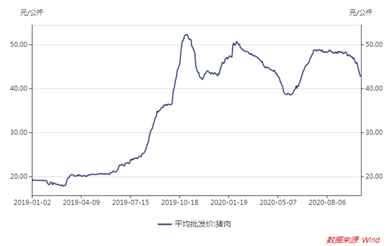 全国猪肉平均批发价格也在5月中旬见底,随后快速反弹,在48元附近持续徘徊几个月后,9月中旬开始,猪肉批价出现明显下跌,10月份下跌速度有所加快。