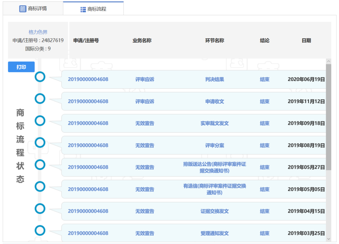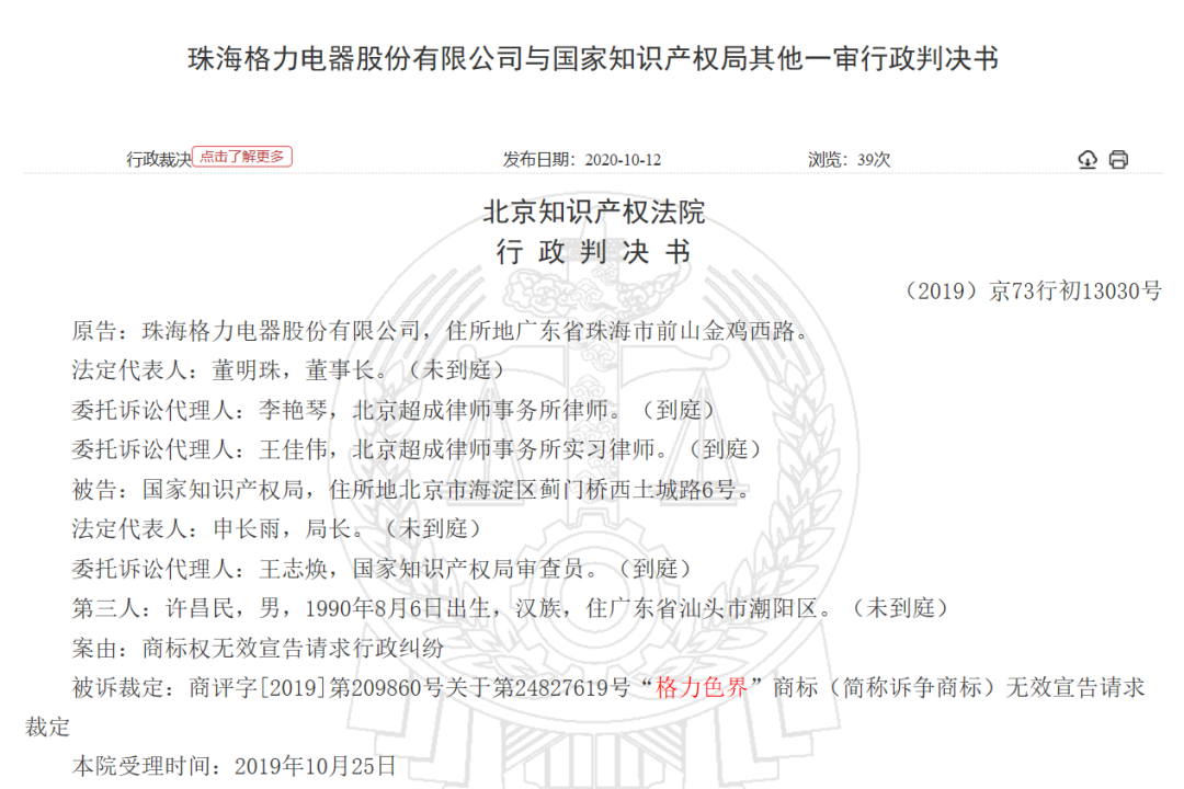 根据中国裁判文书网资料,这起格力电器与国家知识产权局之间的行政纠纷的起因来自国家知识产权局在2019年9月做出的《关于第24827619号“格力色界”商标无效宣告请求裁定书》(商评字[2019]第0000209860号)。