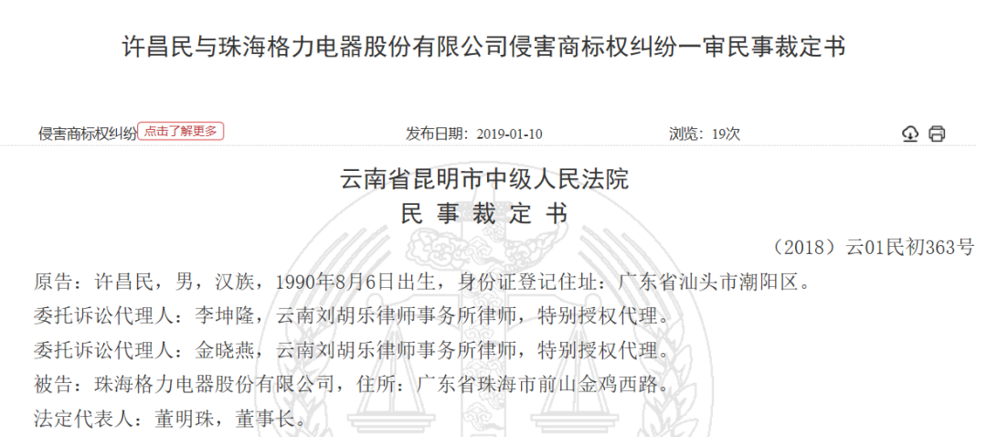事实上,中国裁判文书网一年前的一封《许昌民与珠海格力电器股份有限公司侵害商标权纠纷一审民事裁定书》显示,在2018年,双方就已经就此问题对簿公堂。