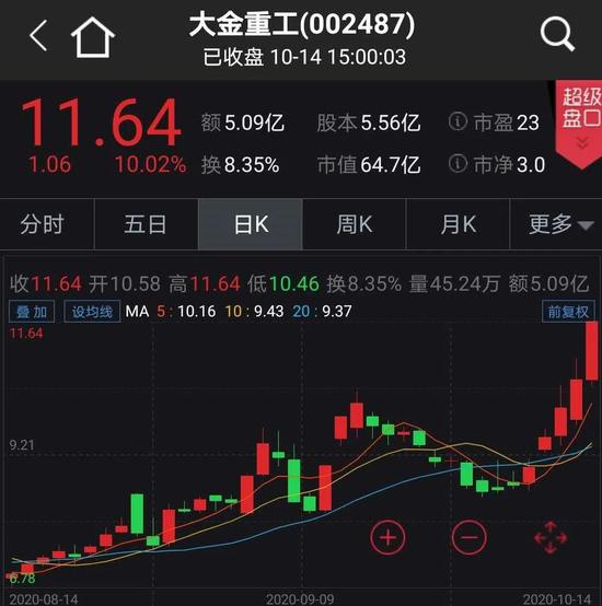 同样涨停的大金重工股价也有来自基本面的有力支撑。大金重工10月12日公告显示,预计2020年前三季度归属于上市公司股东的净利润为2.77亿元-3.32亿元,同比增长150%-200%。13日公司股价涨逾5%,14日涨停,市值突破64亿元。