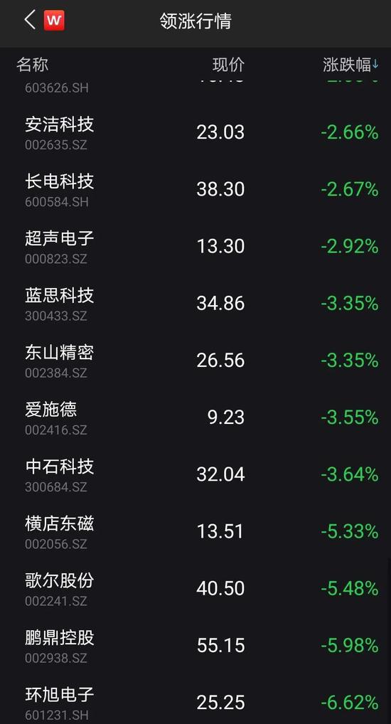 Wind数据显示,苹果概念板块跌2.10%,环旭电子跌逾6%,鹏鼎控股、歌尔股份、横店东磁跌逾5%,中石科技、爱施德、东山精密、蓝思科技等跌逾3%。