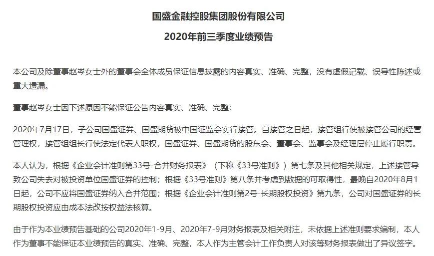 赵岑认为,根据《企业会计准则第33号-合并财务报表》(下称《33号准则》)第七条及其他相关规定,上述接管导致公司失去对被投资单位国盛证券的控制;根据《33号准则》第八条并考虑到数据的可取得性,最晚自2020年8月1日起,公司不应将国盛证券纳入合并范围;根据《企业会计准则第2号-长期股权投资》第九条,公司对国盛证券的长期股权投资应由成本法改按权益法核算。而在赵岑看来,作为本业绩预告基础的公司2020年1-9月、2020年7-9月财务报表及相关附注,未依据上述准则要求编制,因此作为董事不能保证本业绩预告的真实、准确、完整。