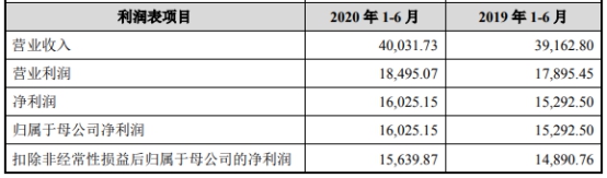 2020年1-6月,公司营业收入4.00亿元,较去年同期增长2.22%;归属于母公司净利润1.60亿元,同比增长4.79%;扣除非经常性损益后归属于母公司的净利润1.56亿元,较去年同期增长5.03%%。