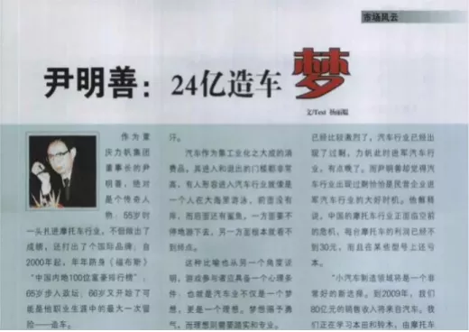 于是,尹明善有了一个新的梦想——造汽车。而在他之前,同样起家于摩托车行业的李书福,已开着吉利汽车先行一步了。