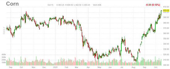 芝加哥期货交易所(CBOT)玉米期货创下14个月高位。最活跃12月玉米合约收涨6-1/4美分,报4.03-3/4美元美元/蒲式耳,盘中一度触及4.04-1/4美元,为2019年8月12日以来的最高水平。