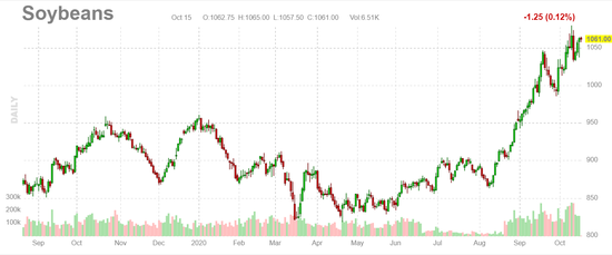 玉米和大豆的这波大行情启动时间稍晚于小麦,大体上是从8月上旬开始。迄今为止,玉米的累计涨幅超过了30%,大豆的累计涨幅达到22%。