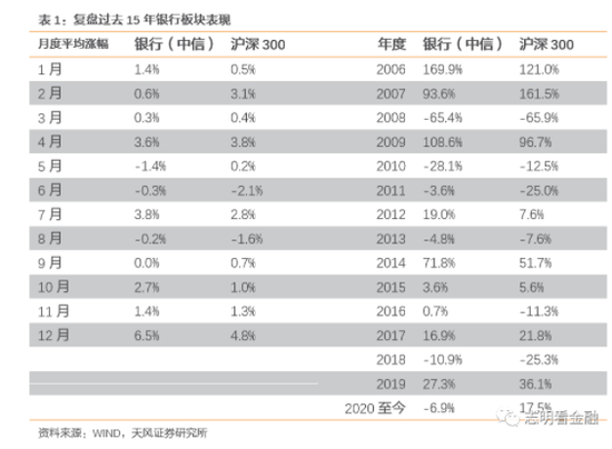 据天风证券统计,过去15年复盘来看,年底银行板块上涨概率较高,12月份平均涨幅6.5%,显著高于其他月份,呈现估值切换行情之特征。例如,2018年银行板块下跌10.9%,次年上升27.3%;13年下跌4.8%,次年上涨71.8%;2008年下跌65.4%,次年上涨108.6%。