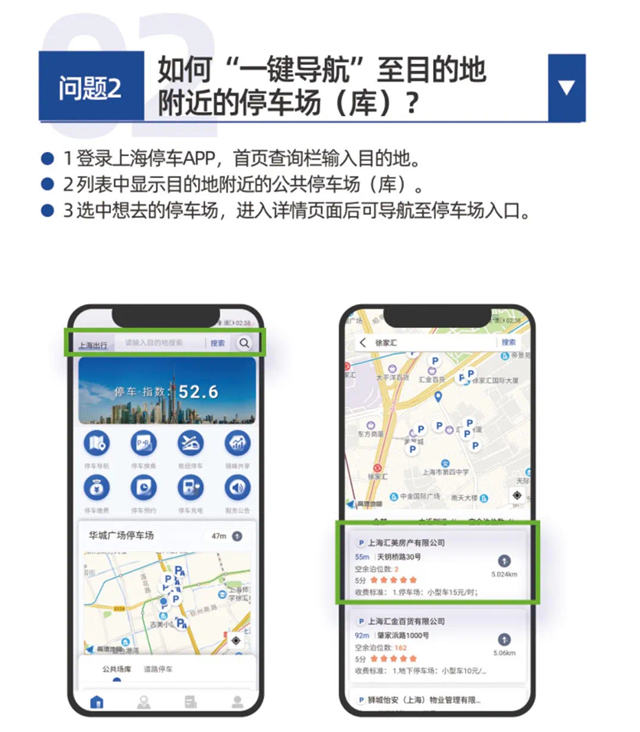 用户可以根据一般临时出行、上下班通勤出行、离沪或接送客出行等不同目的的出行停车需求,通过查询目的地周边停车信息,在出行前提前安排合理的交通方式,在驾车出行时快速找到合适的停车场并一键导航、就近停车。