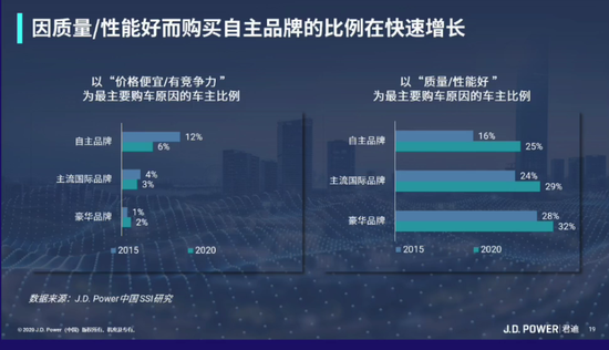 J.D.Power在上述研究中也发现,同意及非常同意自主品牌创新、可靠、环保和声誉好的车主比例分别比2015年增加了12%、9%、7%和10%。与此同时,以质量或性能好为最主要购车原因的自主品牌车主比例从2015年的16%提高至今年的25%,而以价格便宜为最主要购车原因的自主品牌车主比例从12%下降至6%。