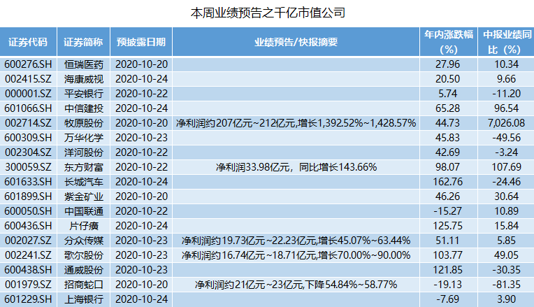 其中,包括恒瑞医药(600276.SH)、海康威视(002415.SZ)、平安银行(000001.SZ)、中信建投(601066.SH)、牧原股份(002714.SZ)在内的17家千亿市值公司将披露三季报。