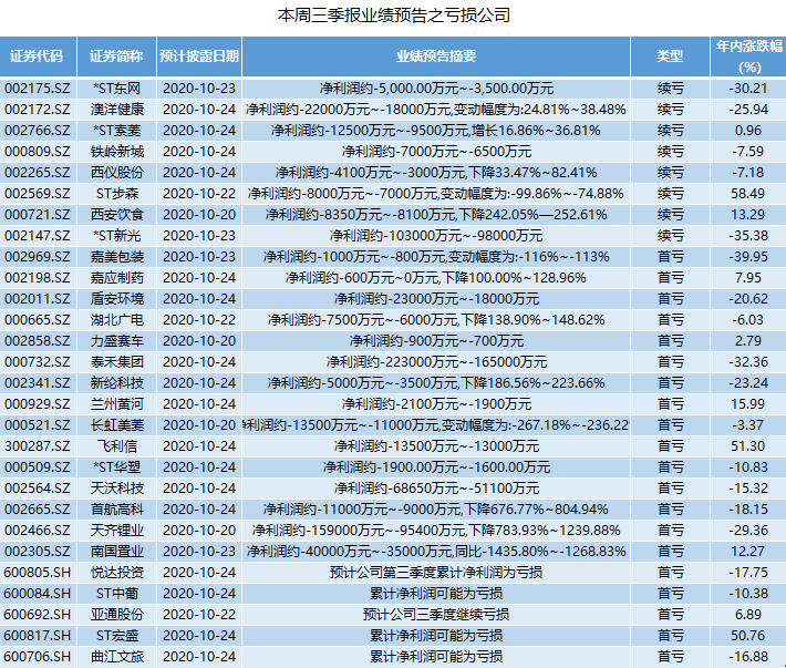 此外,本周还有至少28家公司披露亏损三季报。其中,泰禾集团(000732.SZ)预亏16.50亿元-22.30亿元,天齐锂业(002466.SZ)预亏9.54亿元-15.90亿元,*ST新光(维权)(002147.SZ)预亏9.80亿元-10.30亿元。