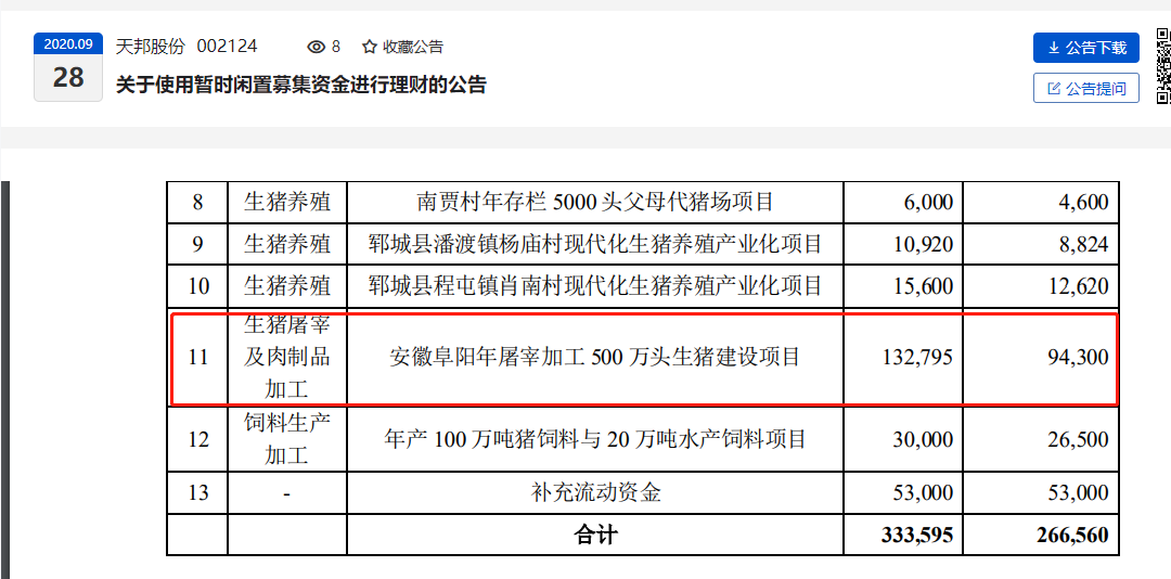 公告显示,天邦股份计划募资的26.65亿元,9.27亿元投资10家生猪养殖项目;9.43亿元用于安徽阜阳年屠宰加工500万头生猪建设项目;2.65亿元用于年产100万吨猪饲料与20万吨水产饲料项目。