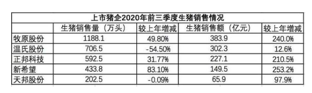数据显示,五大上市猪企中,牧原股份、 正邦科技 和 新希望 今年前9个月累计销售收入增幅均超两倍,天邦股份销售收入也接近1倍增长, 温氏股份 在生猪销量减半的情况下,销售收入仍有12.6%的增长。