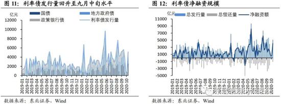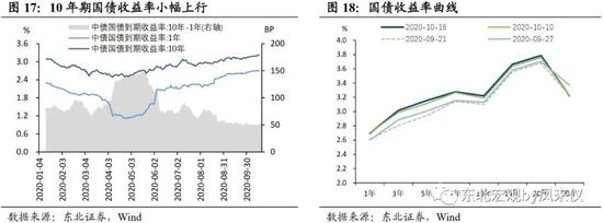 周一,虽然9月PMI公布后市场普遍对经济数据持乐观预期,但美国财政刺激仍无定数,引发风险偏好回落猜测,利率新高也吸引资金配置拉低利率水平,10年期国债收益率下行0.37BP。周二,9月出口数据延续前期势头,进口数据也超预期,带动债市走弱,10年期国债收益率上行0.89BP。周三,9月金融数据公布,新增社融和信贷均超预期,强化了对实体经济复苏的乐观预期,国债利率普遍上行。周四,央行开展5000亿MLF操作,叠加通胀数据回落,但市场经济预期的方向仍未改变,10年期利率上行1.5BP。周五,现券小幅回暖,10年期国债收益率降0.98BP。近期债市受国内经济和金融数据带来的影响较大,经济基本面超预期引发债市下挫。在经济基本面稳中向好的预期没有改变的情况下,未来数月需要关注的是美国大选中民主党获胜概率预期增大可能对美国经济复苏速度和中美摩擦带来的影响。资金面上,从三季度金融统计数据新闻发布会上央行表态看,短期内货币政策基调暂不会转变,资金面继续维持紧平衡;供需面上,月初供给压力略大,但鉴于地方债发行接近尾声,后续供给压力逐步缓和。综合来看,债市拐点尚未到来,预计年内延续震荡走弱格局。