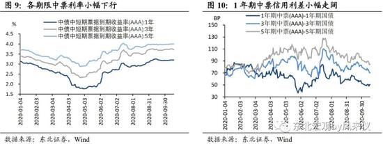上周中票利率小幅下行,3年期中票利率回落幅度相对较大。截至10月16日,1年期AAA中票到期收益率下行0.08BP,对应1年期国债收益率下行0.56BP。3年期、5年期AAA中票到期收益率分别下行4.93BP和0.31BP,对应国债收益率分别上行2.87BP和4.13BP。上周受国债收益率走高影响,3年和5年中票信用利差同步收窄,但1年中票信用利差稍稍走阔。上周1年期较前一周走阔0.48BP,3年期、5年期AAA中票信用利差较上周分别收窄7.80BP、4.44BP。