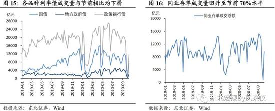 上周利率债成交规模与节前两周相比,各品种均有不同程度下滑。上周利率债成交量为21070.44亿元,较节前(9月25日)相比,成交量环比下降11888.80亿元。分品种来看,上周国债成交7391.36亿元(较节前下降3640.76亿元);地方政府债成交2007.82亿元(较节前减少1604.28亿元);政策银行债成交11671.26亿元(较节前下降6643.76亿元)。上周同业存单成交量回升至节前的70%。上周同业存单成交量为9657.69亿元,相比节前(9月25日)减少4021.38亿元。