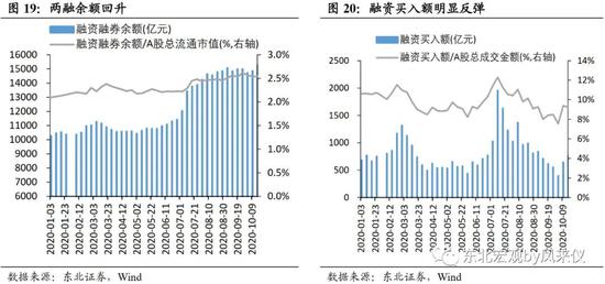 上周杠杆资金快速流入,A股成交额反弹至近5周来最高水平。截止10月17日,融资融券余额增加389.89亿元,流入规模较前一周增加256.52亿元;上周A股流通市值为59.92万亿,较前一周减少1.33万亿;上周融资融券余额占A股流通市值的2.54%。上周融资买入额为758.92亿元,较前一周增加114.16亿元;上周A股总成交额为8228.73亿元,较前一周减少1354.68亿元;上周融资买入额占A股成交额的9.22%,环比减少0.16%。