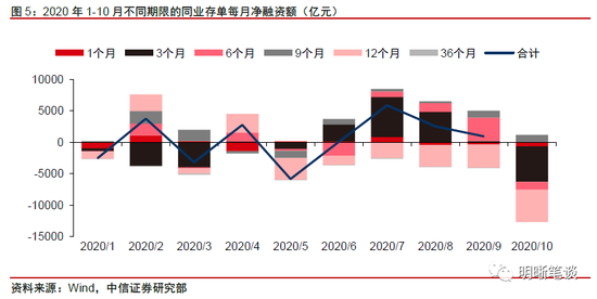 净融资额角度,6月份起同业存单净融资额大幅增长。同业存单净融资额在5月份最低,6月回正,7月达到高点。从不同期限同业存单对净融资额变化的贡献来看,5月份开始1年期同业存单到期量始终大于发行量,3个月额和6个月同业存单净融资额较大。9月份3个月同业存单融资净额显著下降,发行和到期量趋于平衡;同时,6个月同业存单净融资额显著增加。10月,3月期、1年期同业存单集中到期,跨年资金压力逐步显现。