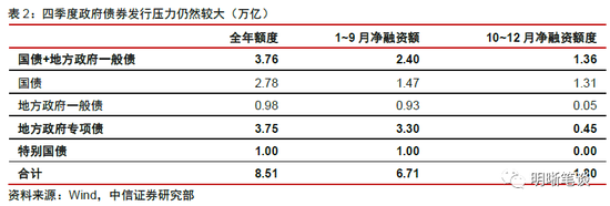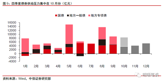 政府债券发行压力主要集中在10月份,财政集中支出主要集中在12月份。1~9月份除特别国债外,国债+地方政府债净融资额5.7万亿,年内仍有1.8万亿供给规模。由于地方政府专项债将在10月份发行完毕,参照历史年份四季度国债的发行节奏,四季度政府债券发行压力主要集中在10月份,其次是12月,11月政府债券发行压力最小。而11月份起财政支出将逐步加速,但财政支出主要集中在12月份。