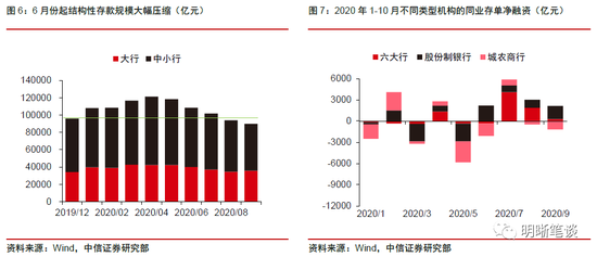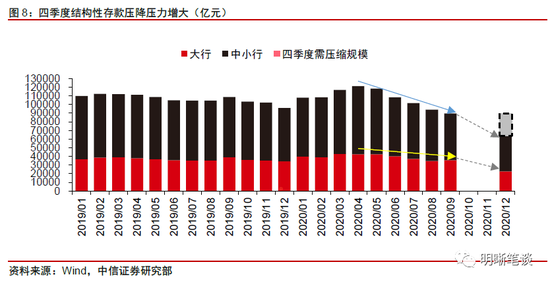 结构性存款压缩压力更大。9月末结构性存款规模已经压缩至8.975万亿,完成了在2020年9月30日之前将结构性存款规模压降至年初规模的目标。若要在2020年12月31日之前压降至年初规模的三分之二,则四季度仍然需要压缩结构性存款2.58万亿元,每月需要压降8584亿元,而5月到9月这5个月平均每个月只压降了6329亿元。因而四季度结构性存款压降压力更大,其中六大行+国开行仍需压降1.30万亿,中小行需压降1.27万亿,大行压降压力明显更大。