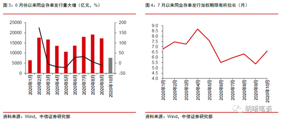 同业存单量增价涨,银行缺负债持续。货币市场利率自5月份启动上行趋势直到7月份出现企稳迹象,但银行体系流动性边际收紧并没有明显缓解,短端资金利率的企稳并没有对应着银行负债紧张的缓解,商业银行同业存单利率持续上行。与此同时,同业存单规模也快速增长,在一定程度上弥补了结构性存款压降和一般存款增长缓慢的问题。
