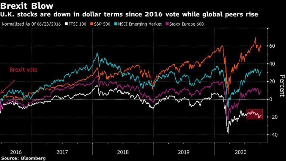 英国股市也可能面临动荡。自英国脱欧公投以来,该国股票的表现落后于全球同行,目前的相对估值处于历史低位。