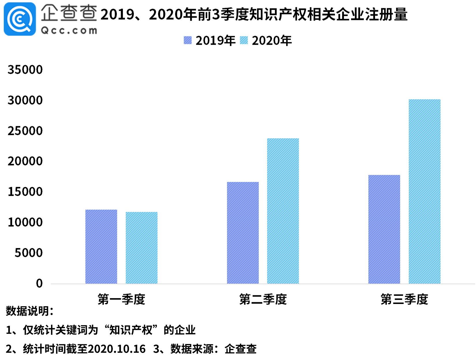 企查查数据显示,今年前3季度知识产权相关企业注册量达6.5万余家。其中,一季度相关企业注册量达1.2万家,与2019年同期基本持平;二季度注册量达2.4万家,是一季度注册量的2倍,同比增长43%;三季度需求持续增长,相关企业注册量达3万家,同比增长70%。