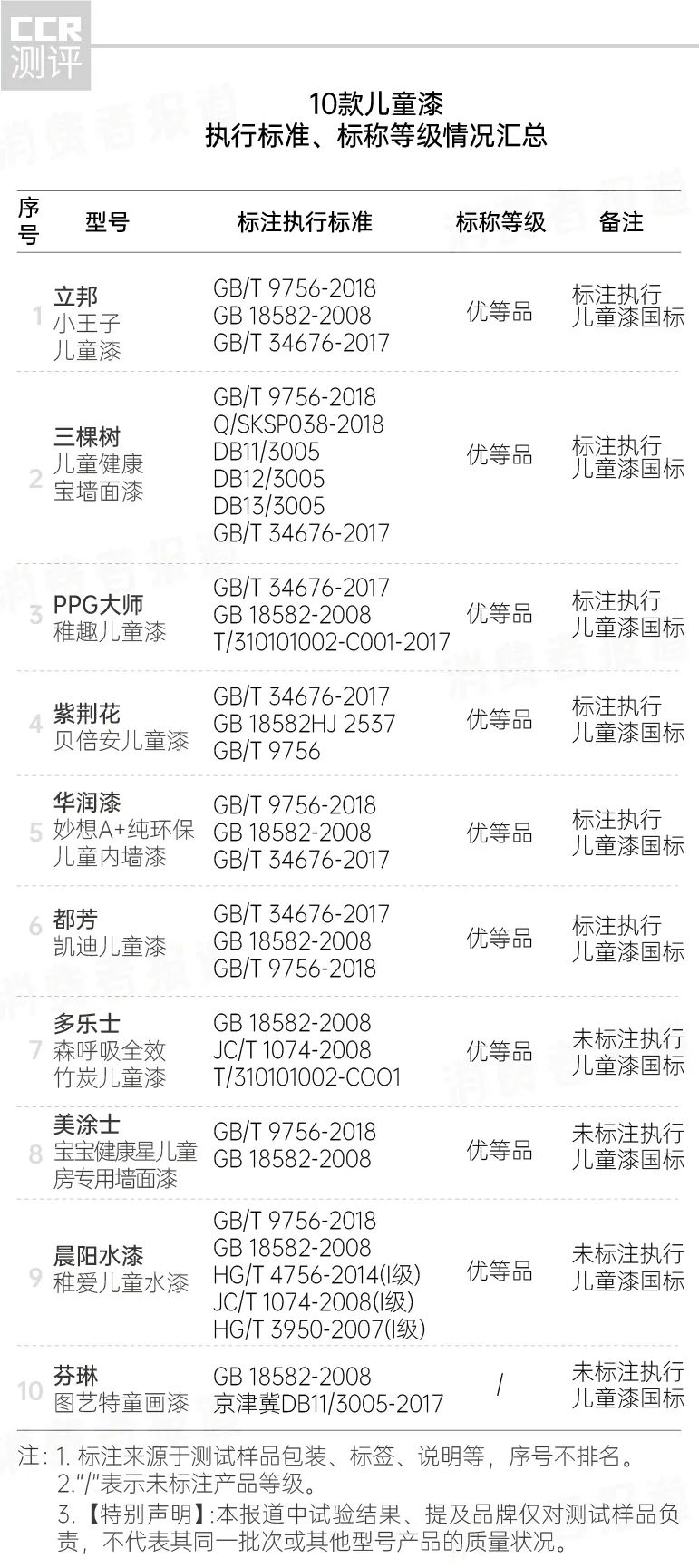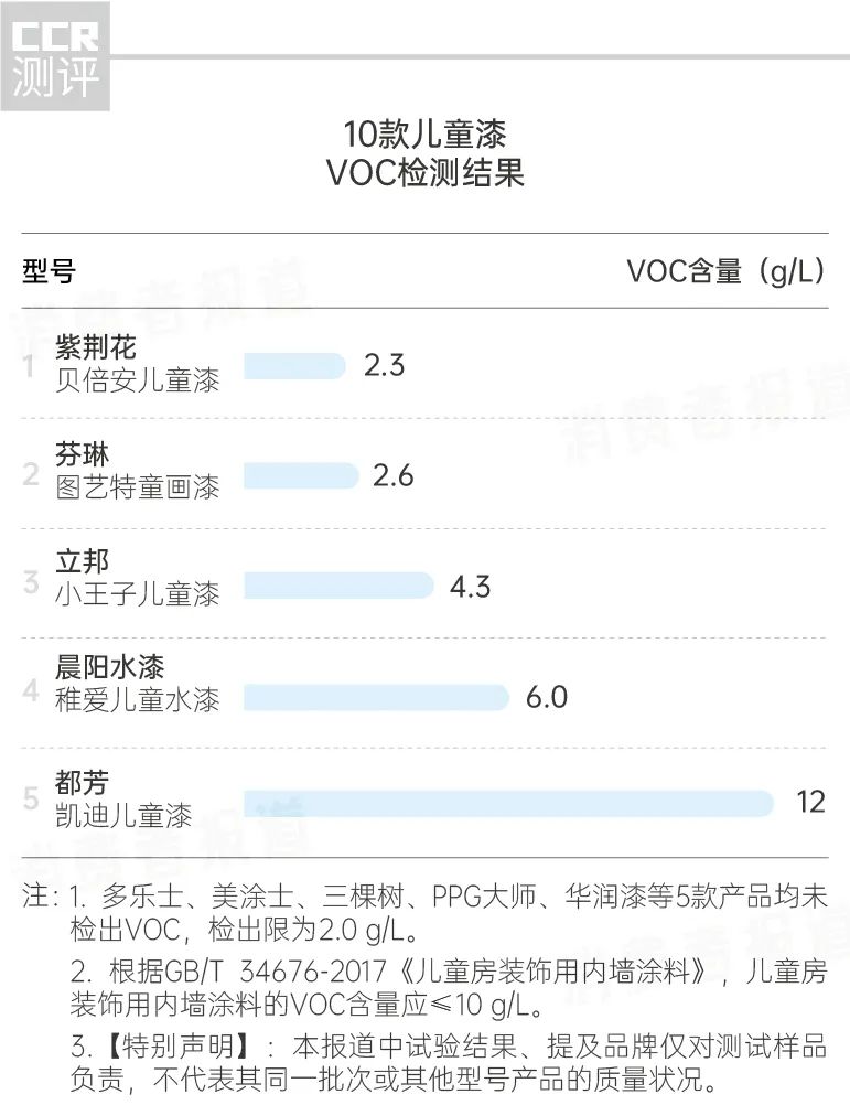 2020年6月,《消费者报道》从市面上选购了立邦、三棵树、多乐士、紫荆花、华润漆、芬琳、PPG大师、都芳、美涂士、晨阳水漆等10款儿童漆,送到第三方权威检测机构进行了检测。