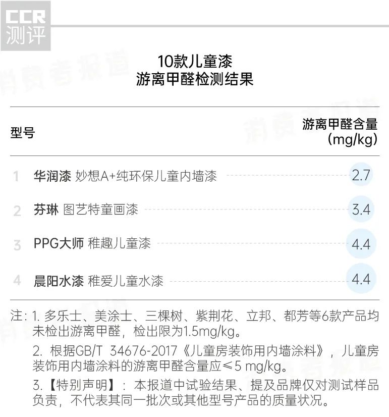 检测结果显示,PPG大师 、晨阳水漆、芬琳、华润漆等4款儿童漆检出微量游离甲醛,但含量都低于儿童漆标准的限值(5 mg/kg),消费者可放心使用。