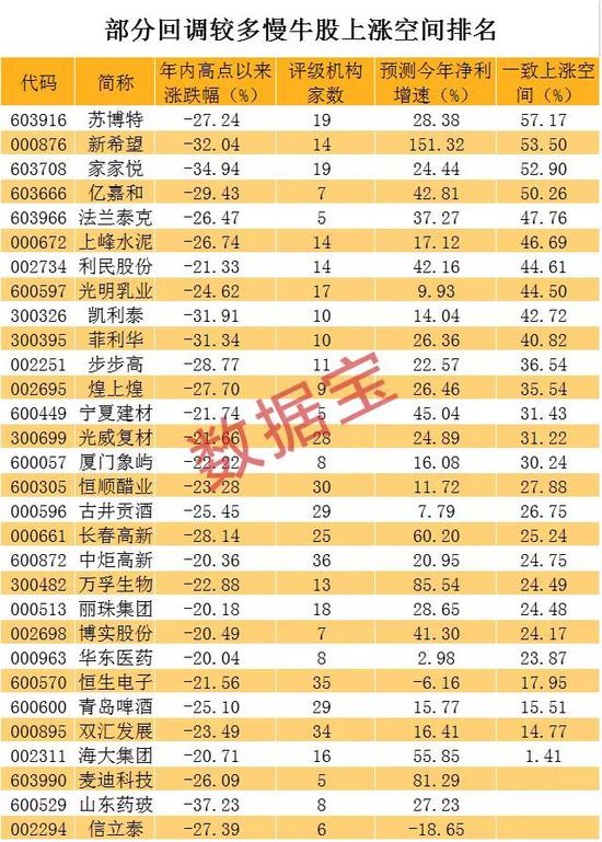 不仅仅是双汇发展,证券时报·数据宝统计显示,剔除科创板个股和次新股,今年股价一度涨超50%且期间涨停板数量为1次或未涨停的慢牛股中,有40多只个股最新价较年内高点已跌超20%。其中跌幅最大的是山东药玻,最新价48.24元,较8月初高点回调超37%。此外,蒙草生态、家家悦、新希望等多只牛股最新价较年内高点回调超过30%。
