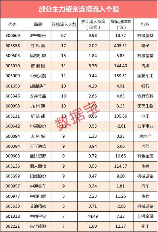 截至10月19日收盘,共有52只个股主力资金连续5个交易日以上持续净流入,连续流入天数最多的是沪宁股份,该股已连续67个交易日净流入;连续净流入天数较多的还有立昂微、昊志机电等,主力资金分别连续流入17天、15天。