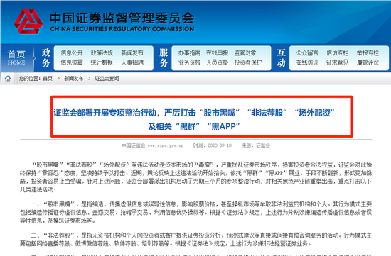 此前,据证监会方面表示,“股市黑嘴”“非法荐股”“场外配资”等违法活动是资本市场的“毒瘤”,严重扰乱证券市场秩序,损害投资者合法权益,证监会对此始终保持“零容忍”态度,坚决持续予以打击。