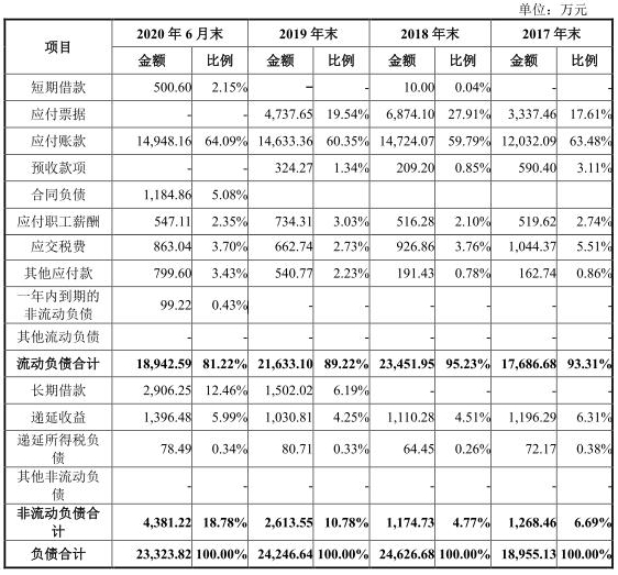 流动负债中,短期借款金额分别为0元、10万元、0元、500.60万元;应付账款金额分别为1.20亿元、1.47亿元、1.46亿元、1.49亿元,占流动负债的比例分别为63.48%、59.79%、60.35%、64.09%。