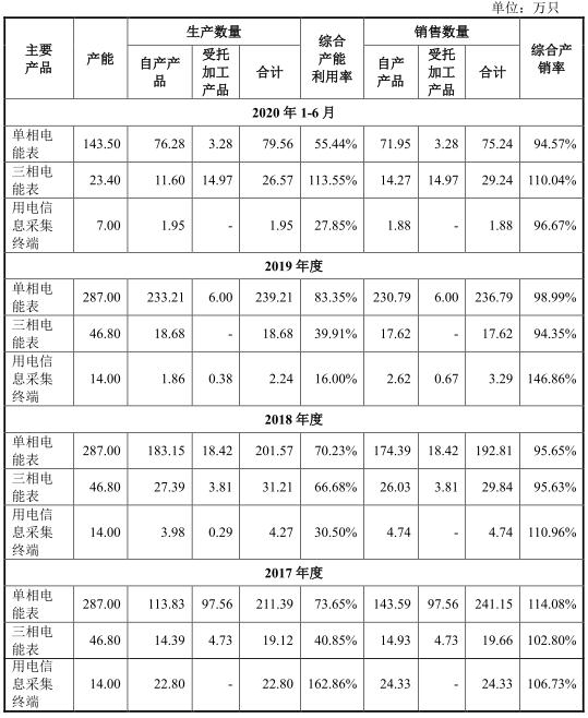 2017年至2020年1-6月,单相电能表产能利用率分别为73.65%、70.23%、83.35%、55.44%;三相电能表产能利用率分别为40.85%、66.68%、39.91%、113.55%;用电信息采集终端产能利用率分别为162.86%、30.50%、16.00%、27.85%。