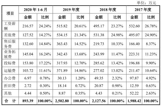2017年至2020年1-6月,西力科技销售费用分别为1988.42万元、2127.56万元、2502.80万元和893.39万元,销售费用率分别为6.27%、5.93%、5.89%和4.52%,同行业可比公司售费用率分别为6.03%、6.28%、6.58%、5.72%。