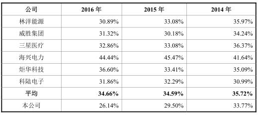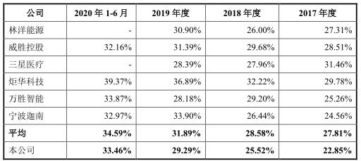 报告期内,同行业可比公司毛利率平均值分别为35.72%、34.59%、34.66%、27.81%、28.58%、31.89%、34.59%。