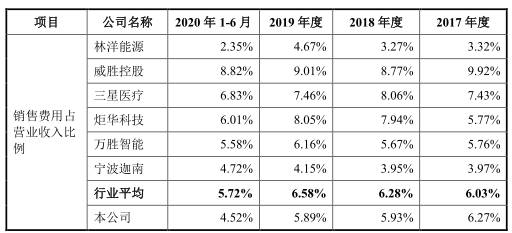 2017年至2020年1-6月,公司销售费用率分别为6.27%、5.93%、5.89%和4.52%,同行业可比公司售费用率分别为6.03%、6.28%、6.58%、5.72%。