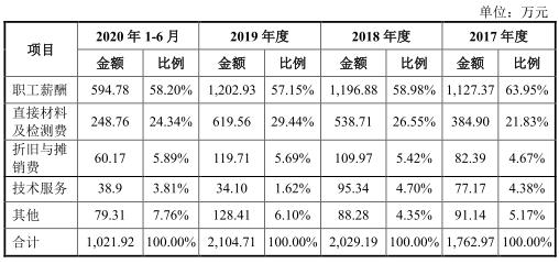 职工薪酬是公司研发费用重要组成部分,占研发费用的比例为60%左右。2017年至2020年1-6月,研发费用中职工薪酬金额分别为1127.37万元、1196.88万元、1202.93万元、594.78万元。