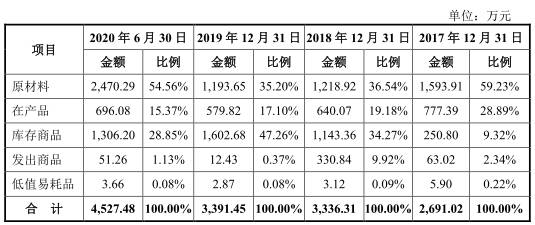 2017年至2020年6月30日,存货中库存商品金额分别为250.80万元、1143.36万元、1602.68万元、1306.20万元,占存货的比例分别为9.32%、34.27%、47.26%、28.85%。