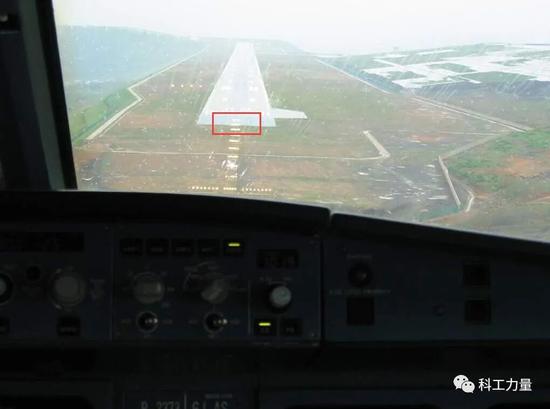 飞机降落攀枝花机场时的驾驶舱视角,本次事故中撞断的灯柱就是红框中的