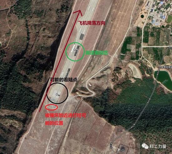 在飞机着陆时,机轮着地位置显然并不在跑道的着陆区,而是在靠近跑道尽头的地方,这也使得飞机飞跃跑道尽头的进近灯柱时高度过低导致了剐蹭。笔者根据攀枝花机场信息,初步判断飞机可能的着陆点距离飞机应当着陆的区域距离有约1000英尺(约300米)。