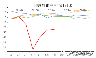 从印度粗钢产量当月同比数据可以发现,印度在经历了一季度的粗钢产量急剧下滑之后,自4月份起快速回升,7月虽然仍处于同比-30%的水平,但数据可以证明印度国内部分钢厂正有序保障生产。
