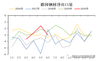 从美国、韩国、德国的钢材净出口量季节性图可以看出,德国受疫情影响最小,今年上半年钢材净出口量同比处于较好水平。美国在经历了4、5月的回暖之后,6月净出口再度回落,尚未摆脱疫情的影响。韩国的钢材净出口处于历年低位,韩国国内的终端复产情况或仍持续受挫。