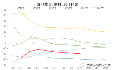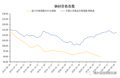 钢材的进口量变化,直接因素是钢材进口利润扩大。从进口钢铁的价格指数和国内钢铁的价格指数,我们可以看到,自2019年6月份以来,价格指数差逐渐扩大。