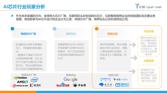作为未来发展的方向,国内AI芯片企业数量快速增加,吸引众多资本涌入。不仅如此,全球各大芯片厂商、互联网巨头也纷纷加码AI芯片,亿欧智库按照企业的创始团队和主要业务背景,将实际参与AI芯片设计的企业分为三类:传统芯片厂商、跨界巨头以及科技初创公司(AI算法系和AI芯片系)。