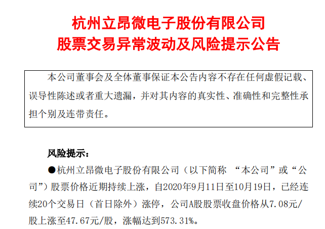 由于股价连续一字板,立昂微上市以来已发布了9次股价异动风险公告。10月19日,立昂微再发布股票交易异常波动及风险提示公告。公司股票价格近期涨幅较大,自2020年9月11日至10月19日,已经连续20个交易日(首日除外)涨停,收盘价格从7.08元/股上涨至47.67元/股,涨幅达到573.31%。