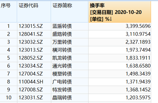 价格爆炒的背后,可转债成交也很活跃。Wind统计数据显示,今日有10只可转债换手率超过1000%,其中蓝盾转债、盛路转债换手率超过3000%。